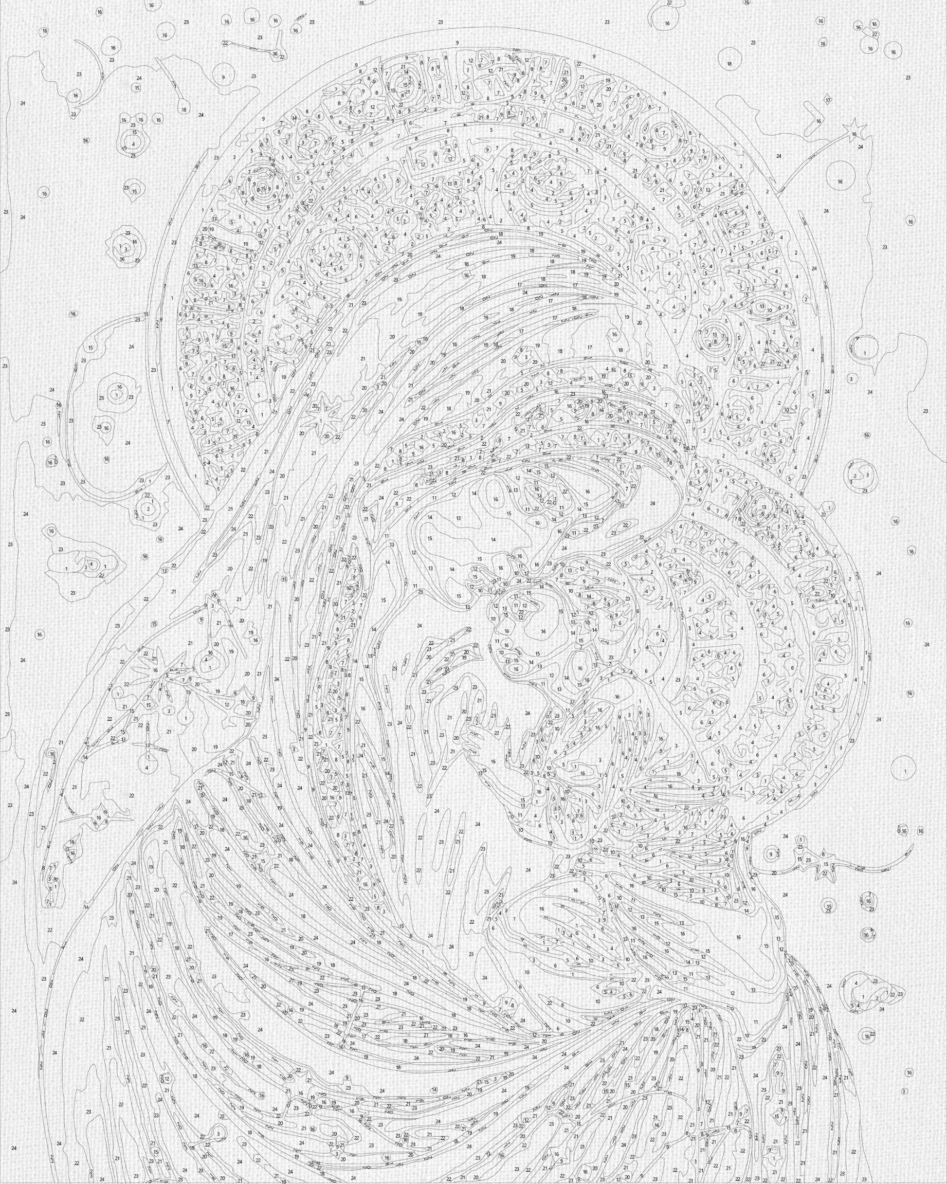 - Plátno s očíslovaným obrysom motívu natiahnuté na drevený rám (bez rámu je maľovanie veľmi nepohodlné, preto v našej ponuke nájdete iba plnohodnotné obrazy)